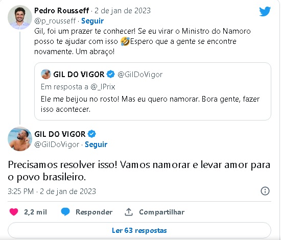 O ex-BBB Gil do Vigor levou um fora do sobrinho-neto de Dilma Rousseff, o político Pedro. Eles se encontraram durante a posse do presidente Luiz Inácio Lula da Silva (PT).