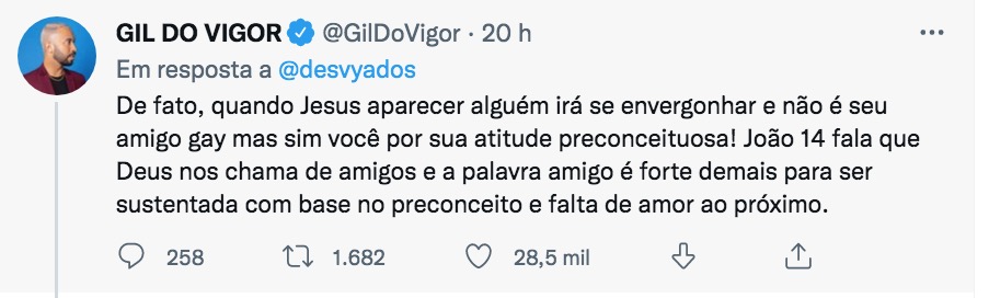 “De fato, quando Jesus aparecer alguém irá se envergonhar e não é seu amigo gay mas sim você por sua atitude preconceituosa! João 14 fala que Deus nos chama de amigos e a palavra amigo é forte demais para ser sustentada com base no preconceito e falta de amor ao próximo”, disparou o ex-bbb ao comentar em um post sobre Bruna no Twitter.