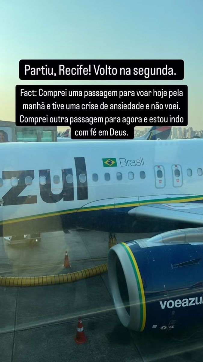 O ex-BBB e economista contou aos seguidores que precisou comprar outra passagem após a crise. "Partiu, Recife! Volto na segunda. Comprei uma passagem para voar hoje pela manhã, tive uma crise de ansiedade e não voei. Comprei outra passagem para agora e estou indo com fé em Deus", disse ele nesta sexta-feira (16).
