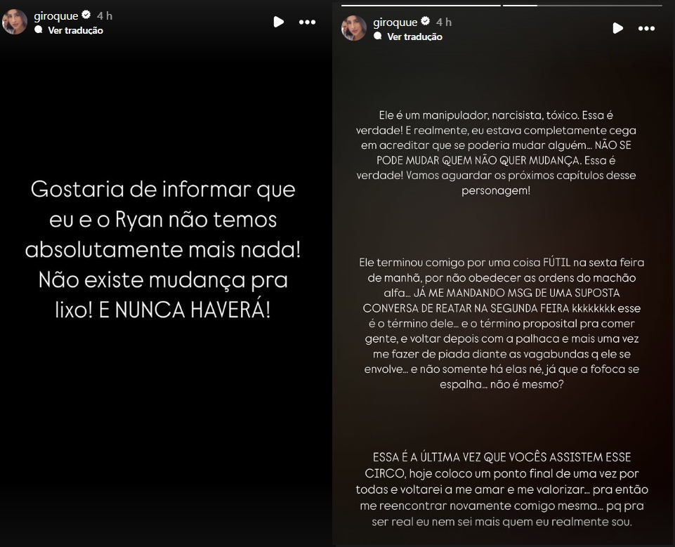 A influencer, que no ano passado foi agredida por Ryan, acusou o MC de ser "manipulador". "Ele é um manipulador, narcisista, tóxico. Essa é verdade! E realmente, eu estava completamente cega em acreditar que se poderia mudar alguém... NÃO SE PODE MUDAR QUEM NÃO QUER MUDANÇA. Essa é verdade! Vamos aguardar os próximos capítulos desse personagem!", detonou.