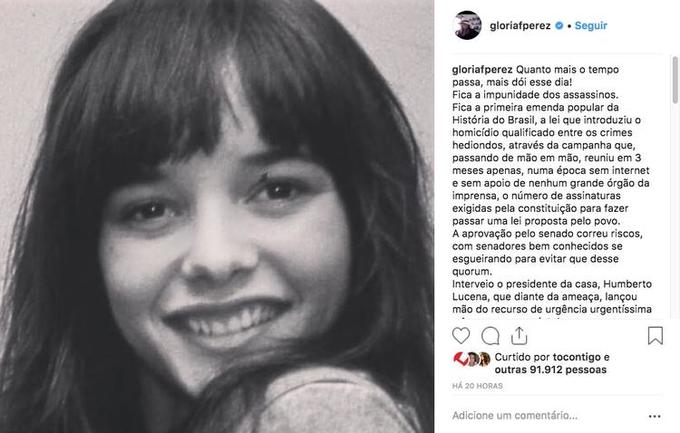 Glória Perez fez um post em homenagem à sua filha, Daniela Perez, que foi assassinada em 1992 pelo ator Guilherme de Pádua, com quem interpretava par romântico na novela "De Corpo e Alma", escrita por Glória. A esposa de Guilherme na época, Paula Thomaz, também participou do crime.