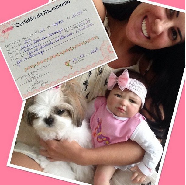 " Estou simplesmente encantada com o trabalho da Dja Brandão. Cheguei em casa e lá estava a nossa filhinha. Mistura minha com o Zezé Di Camargo, é muito amor. Vale a pena conhecer o trabalho. Vem até com certificado de nascimento, bolsinha com roupinha, manta, mamadeira cheia, chupeta... Não gente, só vendo. Obrigada por esse presente lindo que recebemos. Agora preciso de um nome pra ela. Quem me ajuda a escolher? ", disse.
