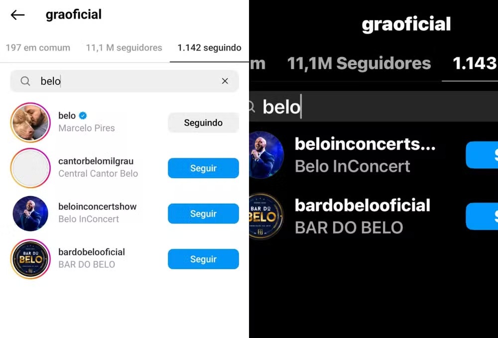 Antes da separação, Gracyanne também seguia uma página de fãs dedicada ao cantor, no entanto, ela também deixou de seguir esse perfil. Belo ainda segue a ex-esposa.