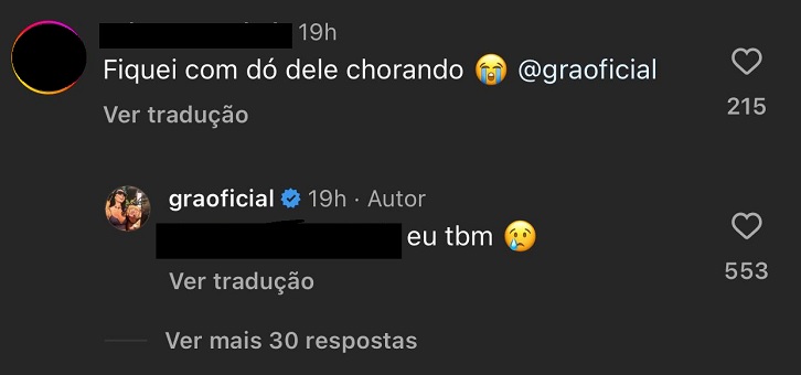 "Fiquei com dó dele chorando", escreveu um seguidor. Na resposta, a musa fitness concordou: "Eu também".