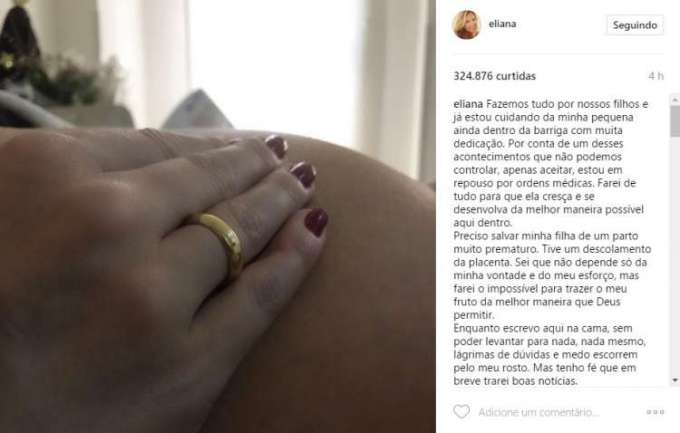 A apresentadora Eliana deve se afastar da TV até o fim da gestação. Nesta segunda-feira (22), nas redes sociais, Eliana revelou que teve um deslocamento da placenta e, por ordens médicas, vai ficar em repouso absoluto.