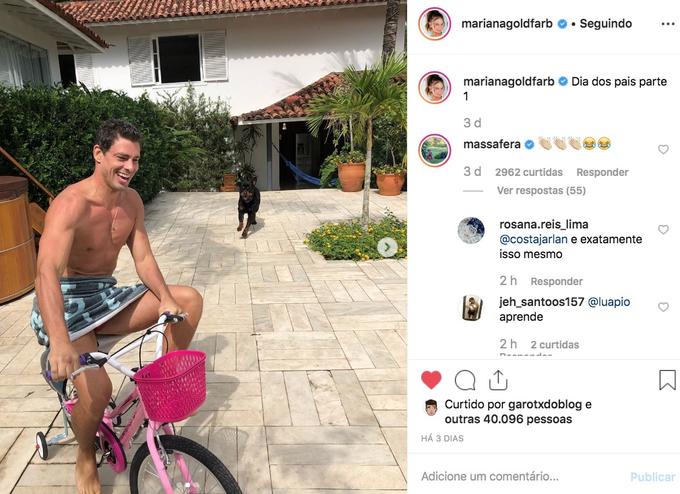 Mariana Goldfarb publicou fotos de Cauã Reymond se divertindo no Dia dos Pais, com a bicicleta da filha. Grazi comentou deixando emojis de aplauso e 'chorando de rir'.