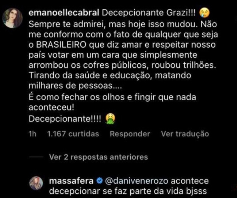 “Que decepção já não sigo mais”, escreveu outra. “Vai tarde”, disparou Grazi. Além da atriz, Zeca Pagodinho, Xuxa, Angélia, Paola Oliveira, Felipe Neto, Fernanda Lima, Rodrigo Hilbert, Rachel Sheherazade, entre outros.