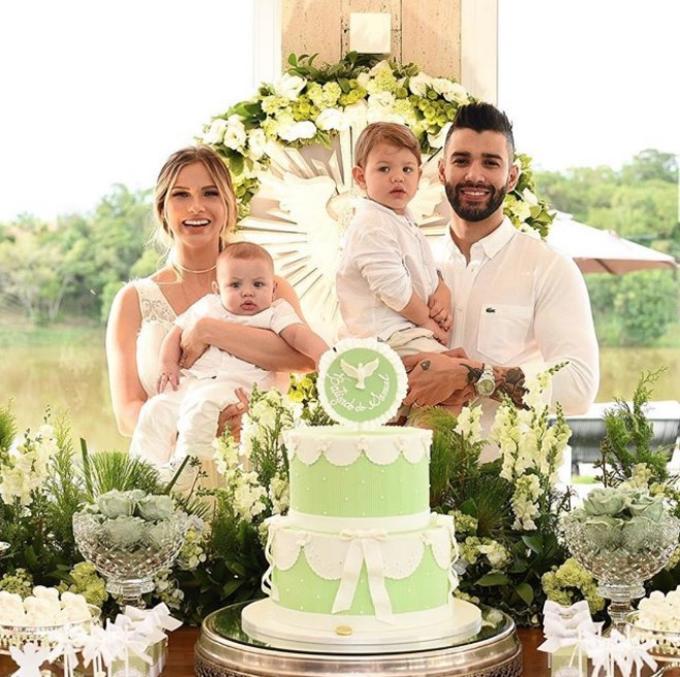 Gusttavo Lima e Andressa Suita batizaram o caçula, Samuel, nessa terça-feira (11) e divulgaram as fotos da cerimônia nas redes sociais.