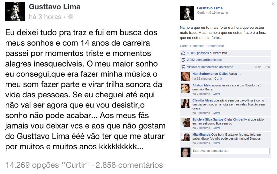Após surpreender o público ao ameaçar abandonar a carreira durante um show em São Paulo, o sertanejo Gusttavo Lima voltou atrás e desistiu da ideia. Ele usou sua página no facebook para assegurar que irá continuar cantando.