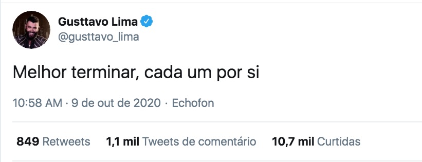 Gusttavo Lima usou o Twitter para comentar sobre a separação de Andressa Suita minutos depois da informação vir à tona.