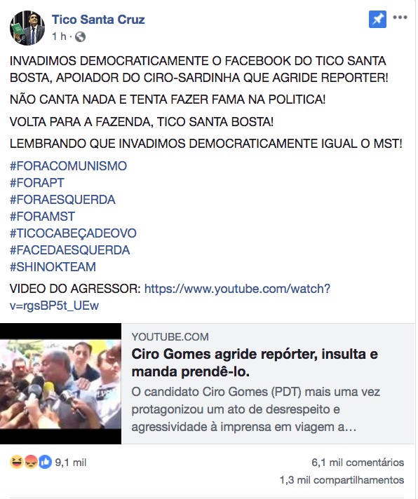 No perfil, os hackers têm postado mensagens a favor do Presidenciável Cabo Daciolo e ofensas ao Cantor Tico Santa Cruz e ao candidato Ciro Gomes, com quem Tico gravou um vídeo na semana passada.