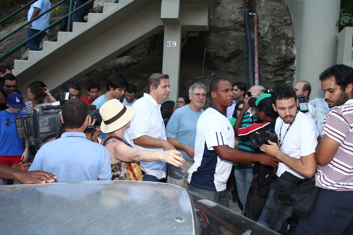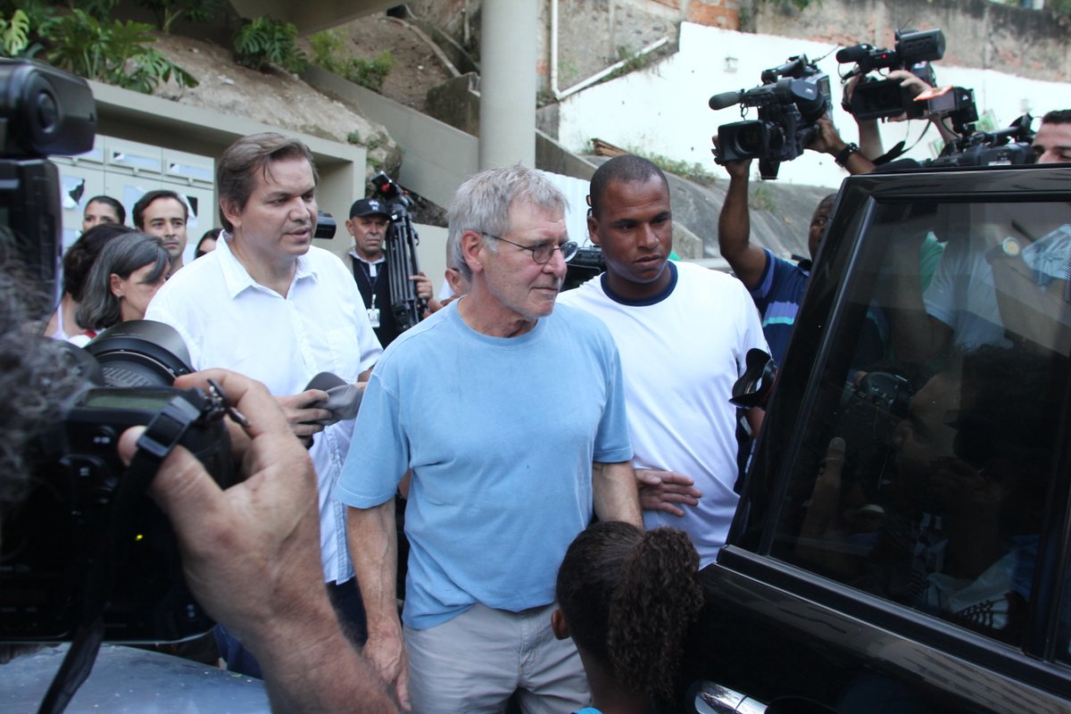 Curtindo suas férias no Brasil com sua esposa e filho, o americano Harrison Ford (protagonista dos filmes de Indiana Jones) usou este domingo (17) para fazer uma visita ao Morro do Chapéu Mangueira, no Rio. O ator causou tumulto, e vários fotógrafos se reuniram no local.