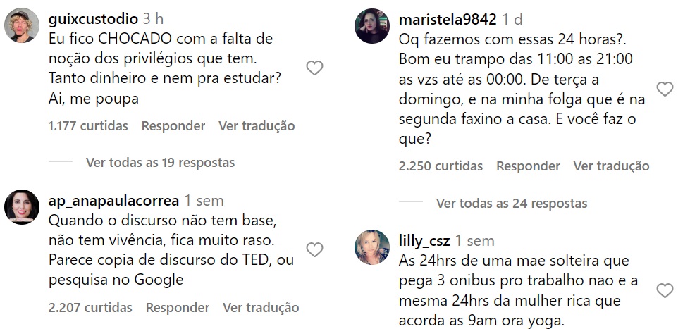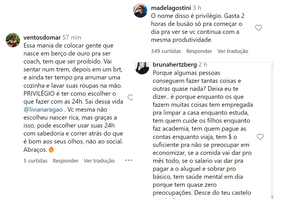 Comentário do perfil @vibeastral no post de Livian: "O problema não é o discurso em si. O problema é usar o “todo mundo”… “todo mundo tem 24hrs no dia”, “o sol nasce para todo mundo”. Esse discurso de meritocracia sem recortes é totalmente vazio, dado que as mesmas 24hrs são diferentes para uma pessoa que passa 4hrs em transporte público se deslocando para o trabalho, que chega em casa e ainda precisa lidar com uma série de demandas domésticas, que às vezes sequer tem uma estrutura de saneamento básica para “ser produtivo”. É fácil falar de “todo mundo” a partir de um lugar onde nunca se precisou lavar um prato na vida. Então meu bem, continue fazendo seu corre, inspirando pessoas, porém não generalize. Fale por você e pelas pessoas inseridas na sua bolha. Contextualize. Culpar o indivíduo pelo próprio fracasse sem considerar uma série de fatores sociais é perverso. Então, não, o sol não nasce da mesma forma para todo mundo…".