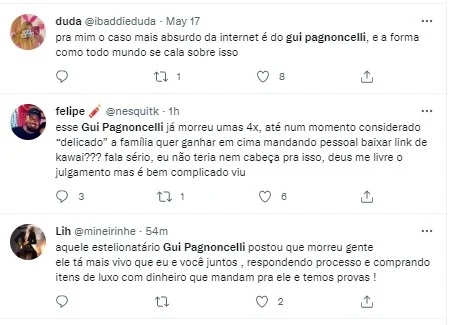 “Duvido que seja verdade. Ele já fez isso uma vez. E ele não estava internado esses dias todos. Ele foi expulso do Hpvida por causa das mentiras”, comentou um internauta. “Ele já ‘morreu’ tantas vezes, como vamos saber se isso é realmente verdade?”, escreveu outro. “Eu já até mandei mensagem no direct para eles darem notícias pelo próprio Instagram dele. Eu que sou seguidora antiga, mas depois que começaram a dar notícias dele somente no Kwai, deixei de acompanhar. Muito triste!”, escreveu outra. “Impossível acreditar em qualquer coisa vindo desse rapaz. Esses dias postou relatando que sofreu parada cardíaca e a foto foi achada no Google”, acusou mais um.