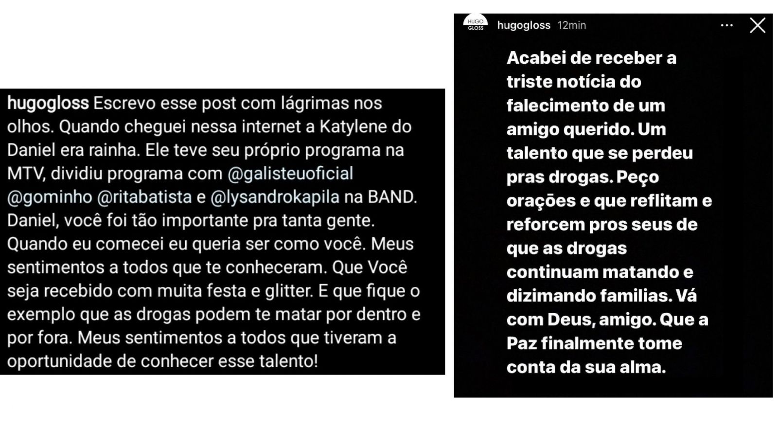 Em nota publicada nas redes sociais, Hugo lamentou a morte de Daniel, disse que admirava muito o seu trabalho mas afirmou que o rapaz “se perdeu pras drogas”. “Que fique exemplo que as drogas podem te matar por dentro e por fora”, escreveu.