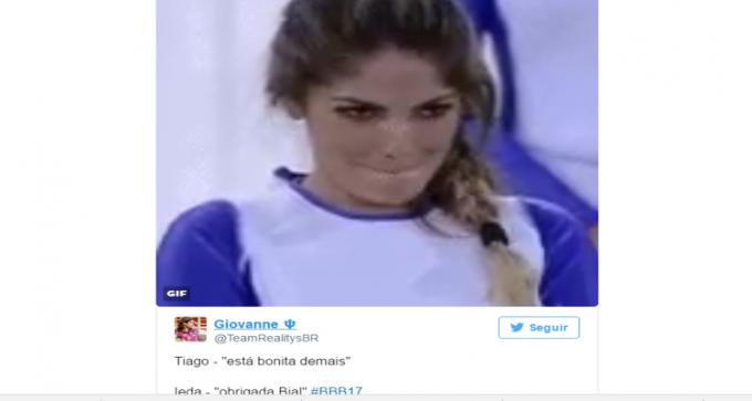 Meio envergonhada, a sister agradeceu o elogio e foi aí que o mico aconteceu, ela confundiu o nome de Tiago: "Obrigado, Bial!", o deslize arrancou risos dos outros participantes e deu origem a várias brincadeiras na internet:
