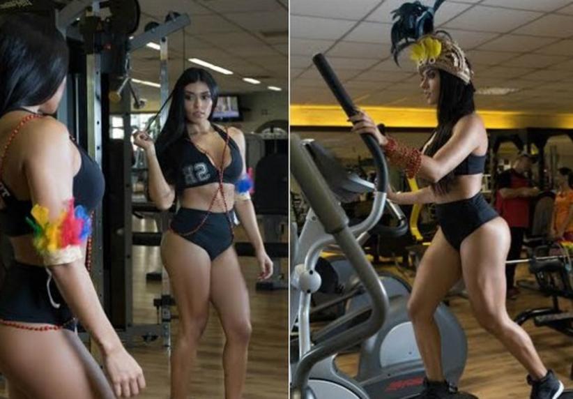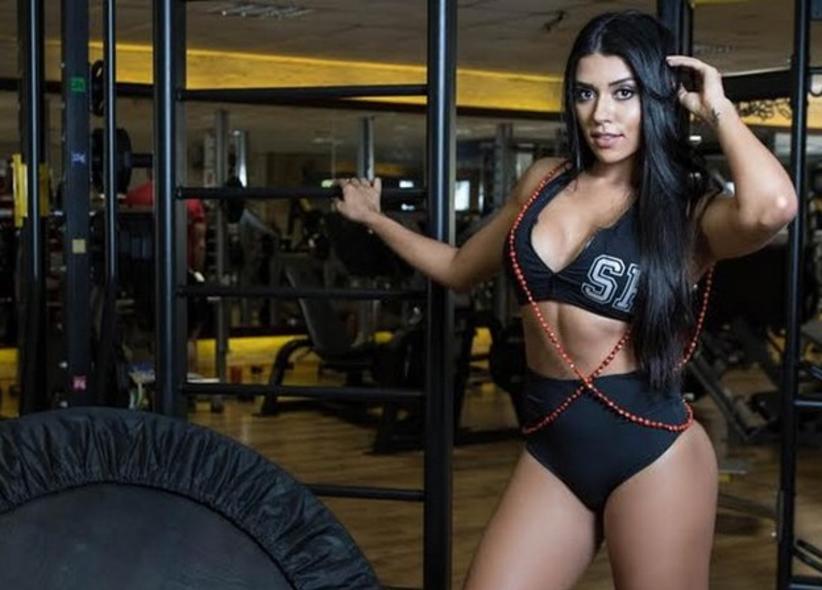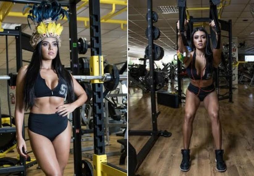 Cintia Vallentim, conhecida como Índia Fitness, fez um ensaio em uma academia e exibiu o bumbum farto.