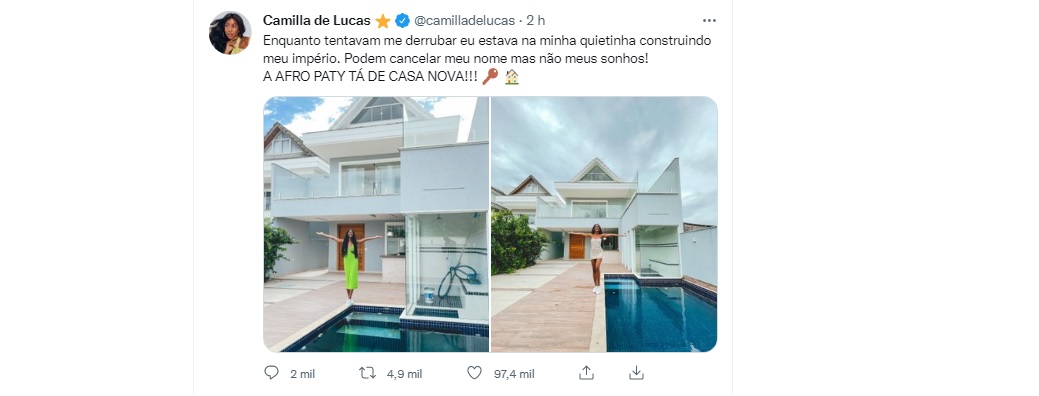 “Enquanto tentavam me derrubar eu estava na minha quietinha construindo meu império. Podem cancelar meu nome mas não meus sonhos! A AFRO PATY TÁ DE CASA NOVA!”, escreveu no Twitter.