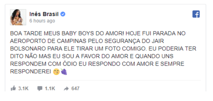 Inês usou o Facebook para responder ao caso e afirmou apenas ter sido um ato de educação já que ela foi chamada pelo político para registrar o encontro. "Hoje fui parada no Aeroporto de Campinas pelo segurança de Jair Bolsonaro para ele tirar uma foto comigo. Eu poderia ter dito não, mas eu sou a favor do amor e quando uns respondem com ódio, eu respondo com amor e sempre responderei", escreveu.