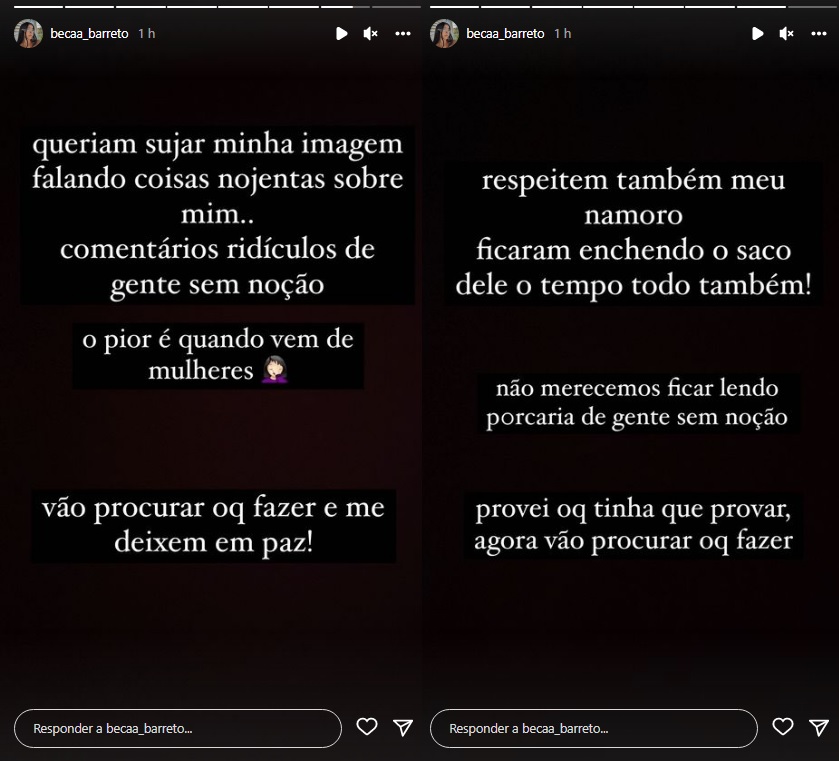 “E além do mais quando eu voltei com meu namorado eu postei pro povo parar, e continuaram mesmo assim. Voltei com o Nilson, achei que eu ia ter paz e não tive P*RRA nenhuma, o povo vai lá e posta a merda de um vídeo dizendo que sou eu, espalhando notícia falsa por aí. Vocês tem merda na cabeça?”.