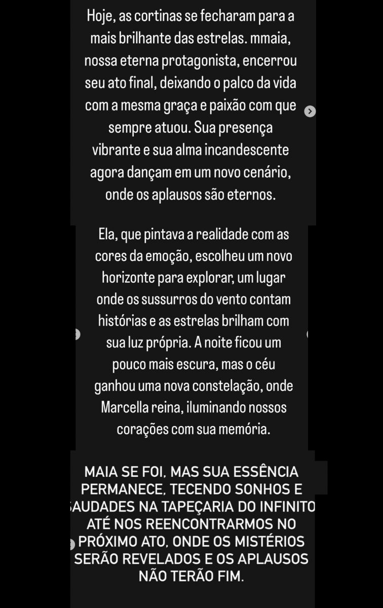 O post, feito pouco antes de meio-dia, diz: “Hoje as cortinas se fecharam para a mais brilhante das estrelas. Marcella Maia, nossa eterna protagonista, encerrou seu ato final, deixando o palco da vida com a mesma graça e paixão com que sempre atuou. Sua presença vibrante e sua alma incandescente agora dançam em um novo cenário, onde os aplausos são eternos", começa o comunicado.