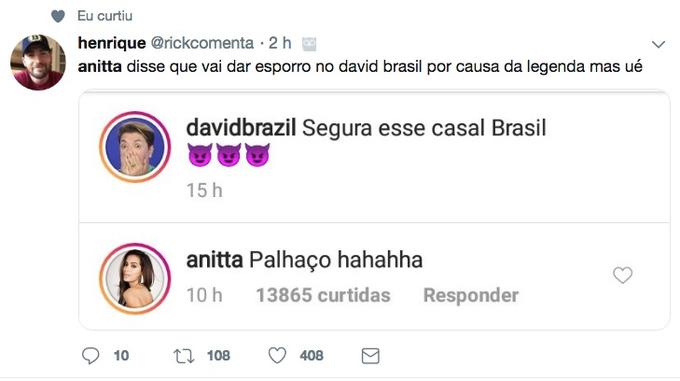 A funkeira foi parar nos trends e está sendo criticada, principalmente, por ter dito que David Brazil havia passado do ponto ao postar uma foto com os dois como se fossem um casal, mas comentou na própria publicação com um risos.
