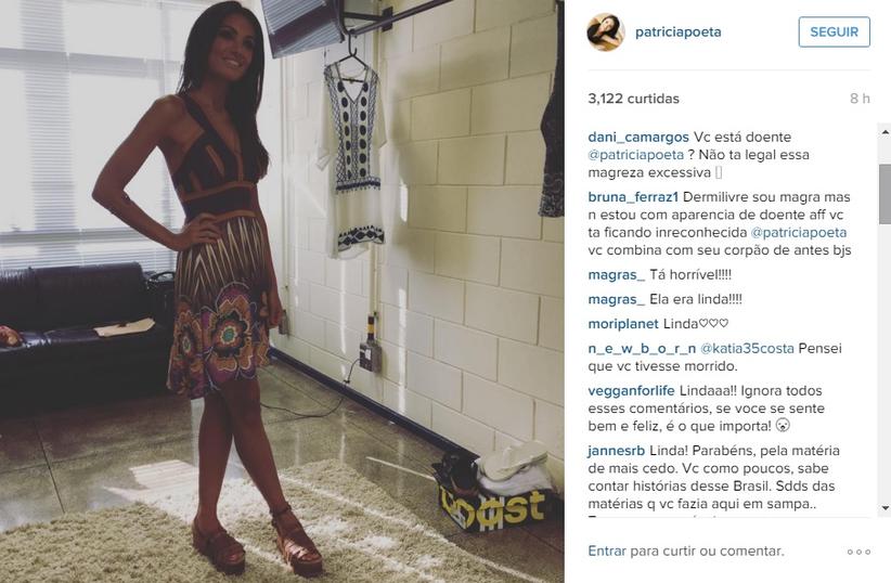 Nas redes sociais, os comentários falando de seu corpo dominam. "Patrícia, você está muito magra, volta a ter aquele corpão, não gostei de ver você assim não. Te admiro muito, beijos!", disse um internauta. "Não a conheço pessoalmente mas você era muito mais bonita antes. Não vai nessa de regime, volta ao que era", pediu outra. "Esquelética e assim ficou feia", escreveu outra mais ríspida.