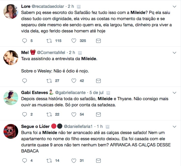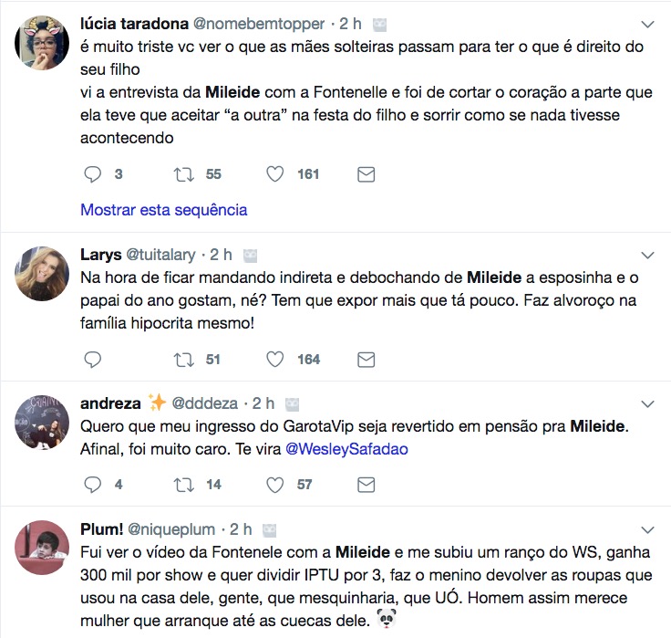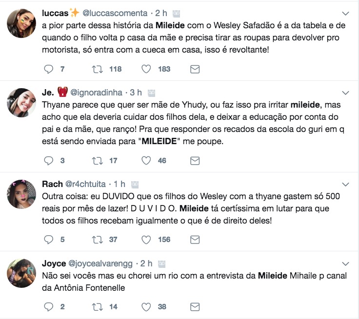 “A pior parte dessa história da Mileide com o Wesley Safadão é a da tabela e de quando o filho volta p casa da mãe e precisa tirar as roupas para devolver pro motorista, só entra com a cueca em casa, isso é revoltante!”, disse uma internauta.
