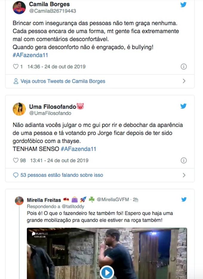 Fãs de 'A Fazenda' estão acusando Netto Rodrigues e Jorge Sousa de fazerem comentários gordofóbicos contra Thayse Teixeira.