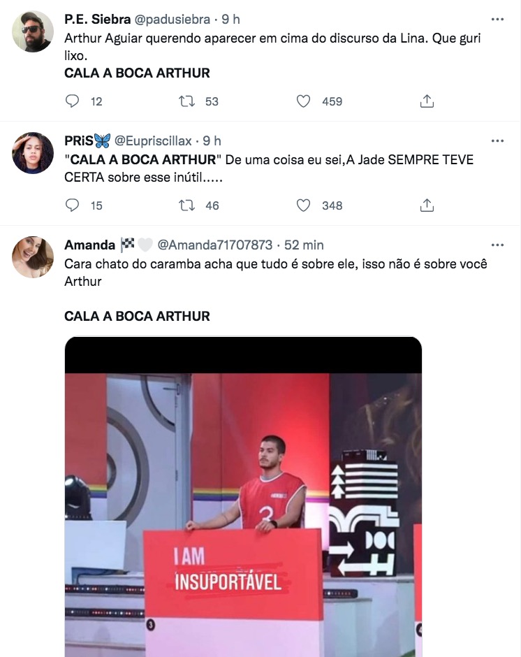 Hoje, a hashtag “Cala a boca Arthur” está entre os assuntos mais comentados do Twitter. Internautas criticam o ator acusando o mesmo de querer “aparecer” em cima do discurso de eliminação de Lina.