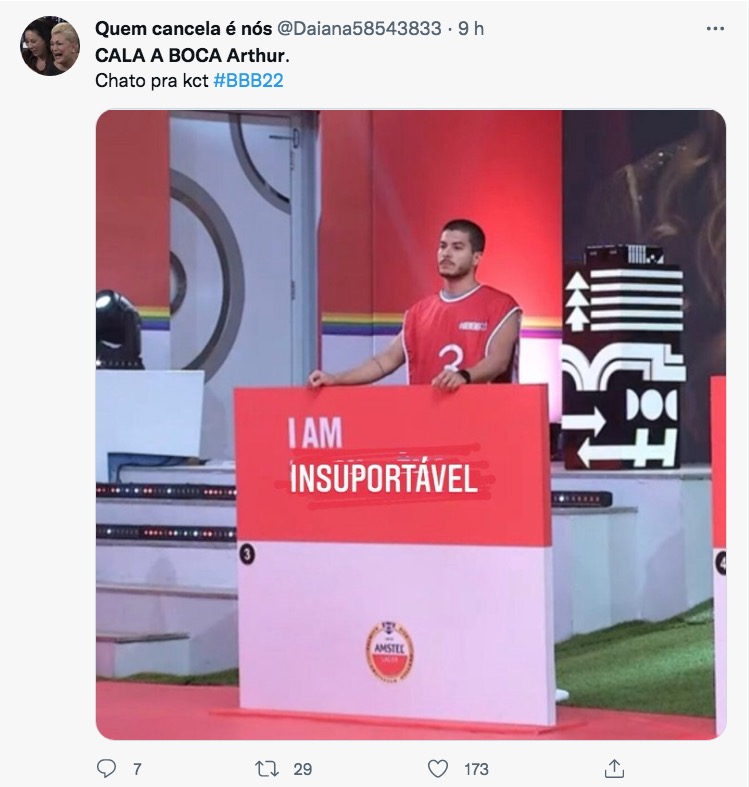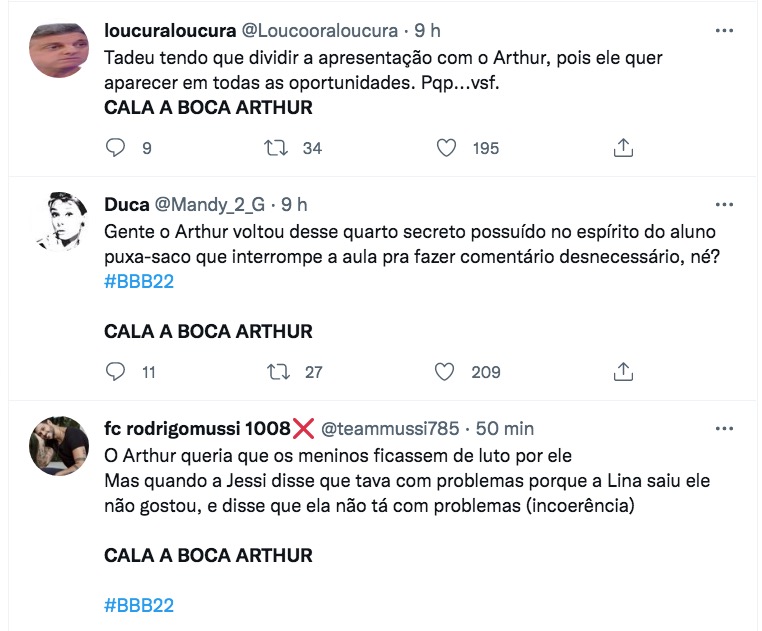 “Cara chato do caramba acha que tudo é sobre ele, isso não é sobre você Arthur. Cala a boca Arthur”, comentou outra pessoa.