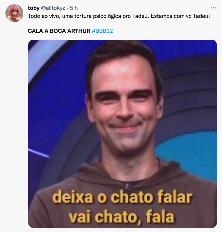Assim que Tadeu voltou para falar com os brothers, Arthur pediu para falar e elogiou o apresentador. A atitude do ator não agradou o público. Para completar, os Admins de Arthur puxaram mutirão “Fora Natália” e a equipe da sister rebateu: “Isso não é sobre você”.