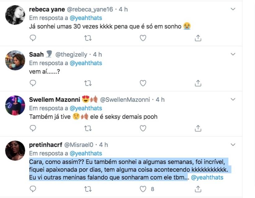 Em resposta, várias jovens disseram ter sonhado com a mesma coisa: "MANO EU TAMBÉM SONHEI COM ISSO, gzuis", respondeu uma. "Sonhei com a mesma coisa na noite passada. Que p*** é essa?", questionou outra. "Pelo visto metade da população", respondeu a internauta. "já sonhei com ele me chamando de príncipa", disse mais uma. "Que delírio é esse? Eu sonhei isso essa noite", acrescentou outra.