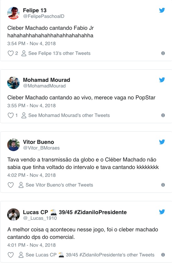 “A melhor coisa q aconteceu nesse jogo, foi o Cleber machado cantando depois do comercial”, brincou outro.