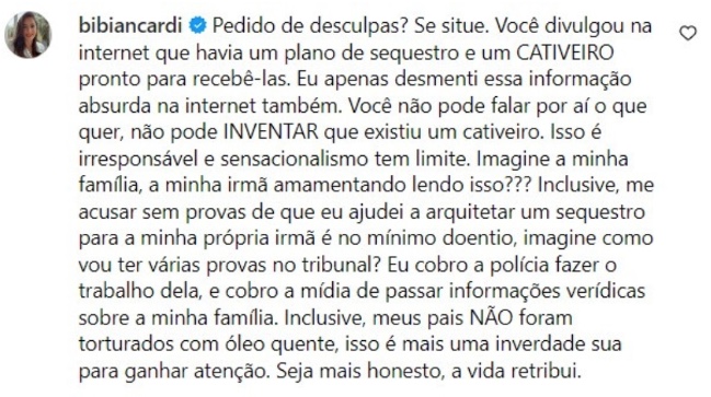 Bianca Biancardi soltou o verbo contra Luiz Bacci após o apresentador detonar a irmã de Bruna Biancardi por tê-lo desmentido sobre alguns detalhes do assalto à casa de seus pais divulgados pelo "Cidade Alerta".