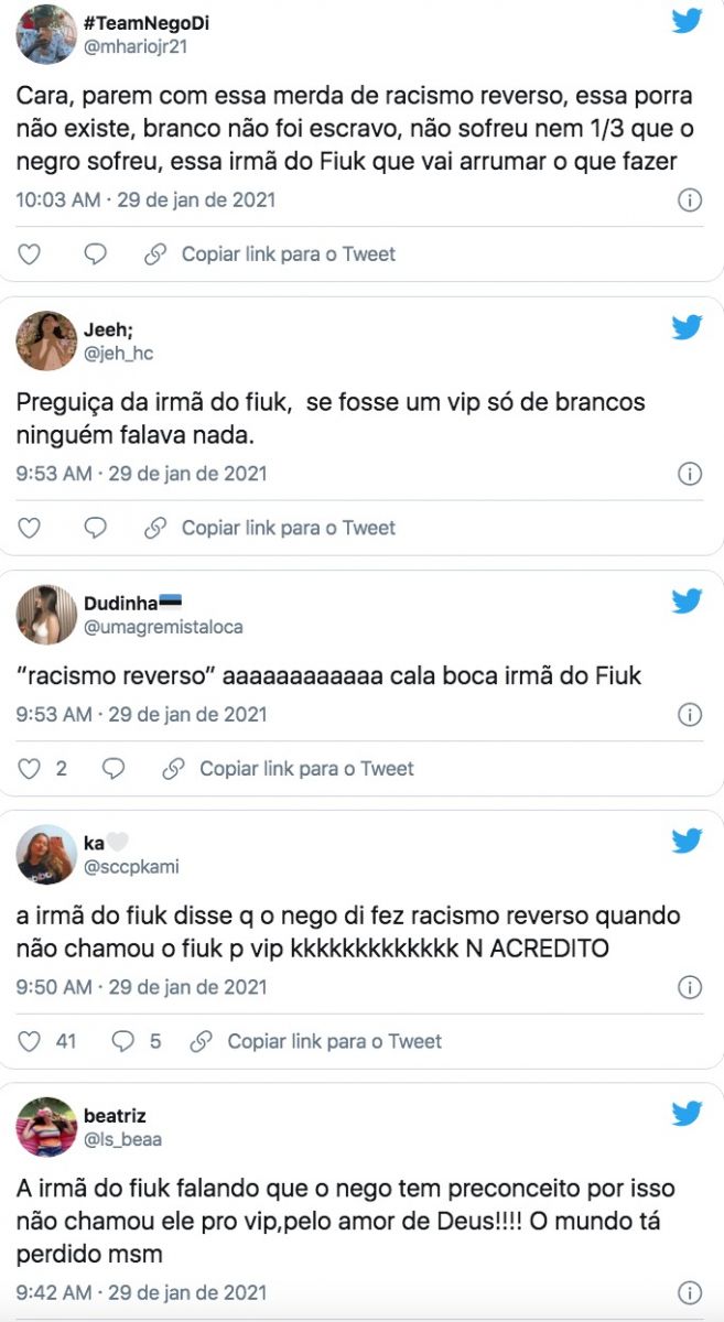O comentário de Tainá foi bastante criticado por insinuar racismo reverso. “De uma vez por todas: racismo reverso não existe, caralhaaaa. Nego di vai priorizar o deles sempre isso é notório, não há preconceito porque não escolheu o Fiuk pro VIP. Os brancos na Xepa e os pretos no VIP, reparação histórica sem dúvidas, melhor coisa é ver vocês brancos se incomodarem com essa situação que, por anos, foi ao contrário”, disparou MC Rebecca.