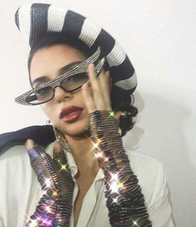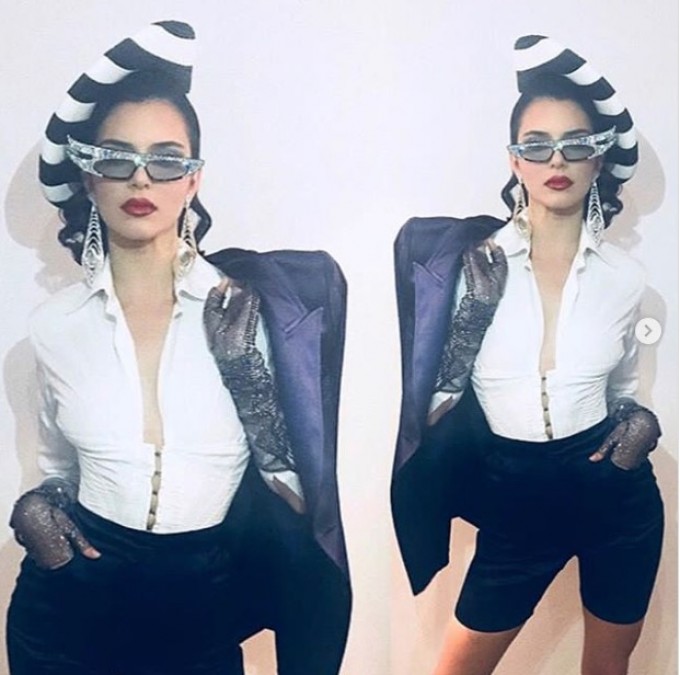 Na imagem, Kendall estava produzida em um look preto e branco, com óculos extravagantes, com o rosto lembrando muito o da brasileira.