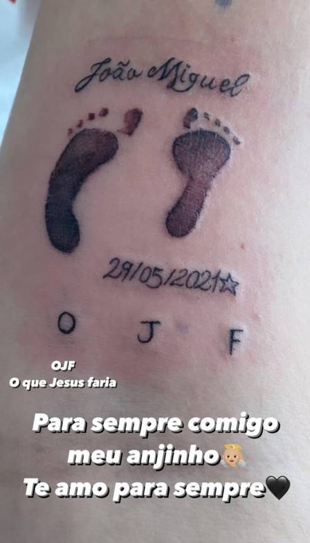 A jovem mostrou nesta terça-feira o resultado do da homenagem permanente, que traz os pézinhos e a data de nascimento do bebê: “Para sempre comigo, meu anjinho", escreveu ela.