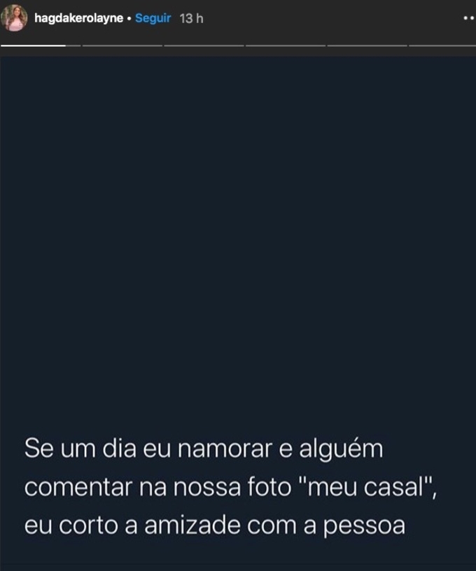“Se um dia eu namorar e alguém comentar na nossa foto ‘meu casal’ eu corto a amizade com a pessoa”, ironizou.