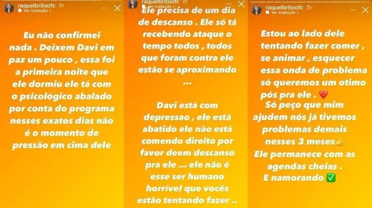 "Davi está com depressão, ele está abatido, ele não está comendo direito. Por favor, deem descanso para ele. Ele não é esse ser humano horrível que vocês estão tentando fazer". "Ele permanece com as agendas cheias. E namorando", disse Raquel.