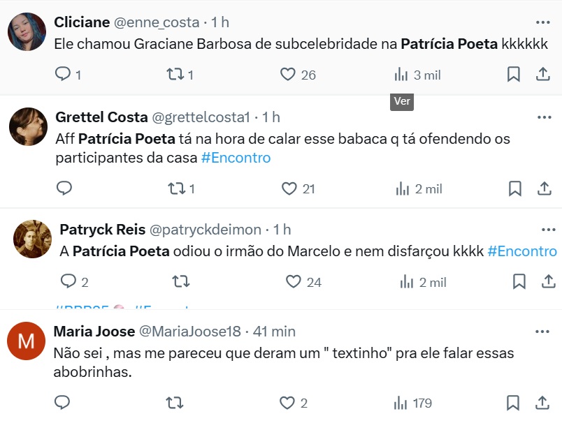 Durante o programa Encontro desta quarta-feira (22), Patrícia Poeta conversou com Marcos, irmão de Marcelo do BBB25, para comentar sobre a eliminação do amazonense do BBB25 ao lado da esposa, Arleane.