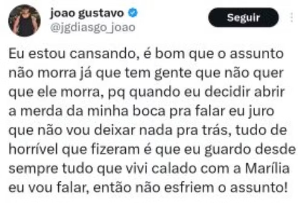 "Estou cansado! É bom que o assunto não morra já que tem gente que não quer que ele morra. Quando decidir abrir a merda da minha boca para falar, juro que não vou deixar nada para trás. Tudo de horrível que fizeram e que eu guardo desde sempre, tudo que vivi calado com a Marilia, vou falar. Então, não esfriem o assunto", disse ele na rede social X.