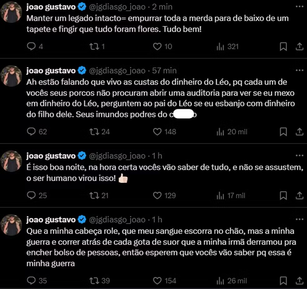 Gustavo ainda rebateu as acusações de que viva com a herança de Leo, filho de Marília. "Por que cada um de vocês, seus porcos, não procuram abrir uma auditoria para ver se mexo no dinheiro do Léo? Perguntem ao pai se esbanjo dinheiro do filho dele, seus imundos, podres do car**ho", disse revoltado.
