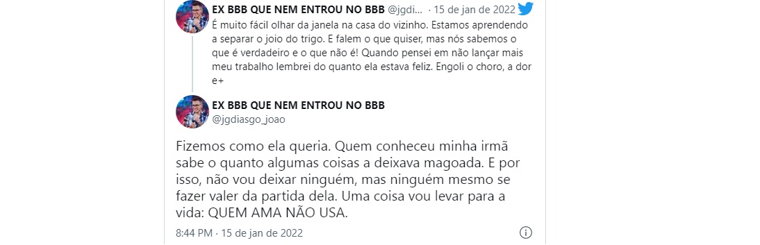 João Gustavo , irmão de Marília Mendonça, fez um novo desabafo após acusar Naiara Azevedo de estar usando a morte da sua irmã para se promover. A exposição teve início após ele ser surpreendido com a notícia de que Naiara vai lançar uma música regravada com Marília Mendonça enquanto estiver no BBB 22