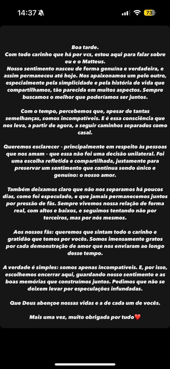 A influenciadora enfatizou que a separação não aconteceu recentemente, como alguns rumores apontavam, e negou que o casal tenha se mantido junto por pressão de fãs. "Sempre vivemos nossa relação de forma real, com altos e baixos, e seguimos tentando, não por terceiros, mas por nós mesmos", esclareceu.