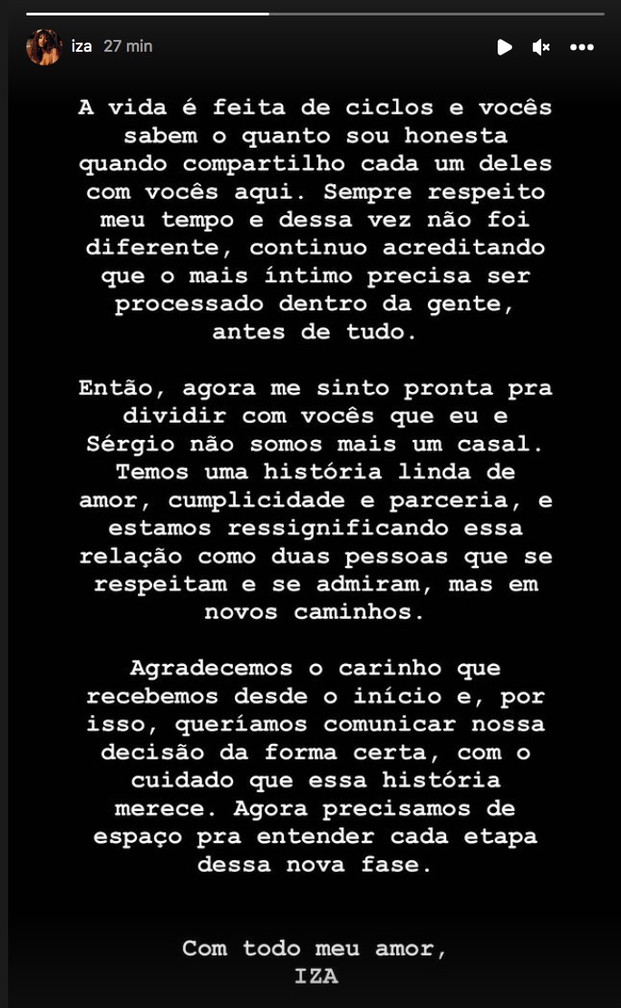 Então, agora me sinto pronta pra dividir com vocês que eu e Sérgio não somos mais um casal. Temos uma história linda de amor, cumplicidade e parceria, e estamos ressignificado essa relação como duas pessoas que se respeitam e se admiram, mas em novos caminhos”, informou a cantora através do stores do Instagram.