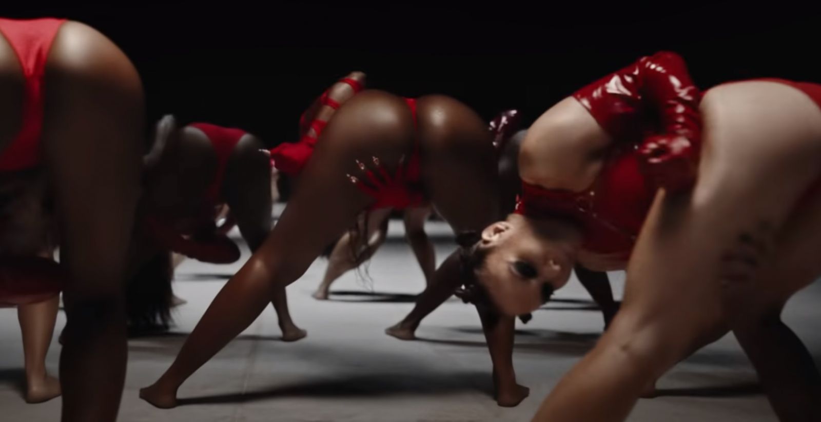 A coreografia deu destaque para o bumbum da cantora. Ela ousou no figurino, com uma peça toda trançada e vermelha.
