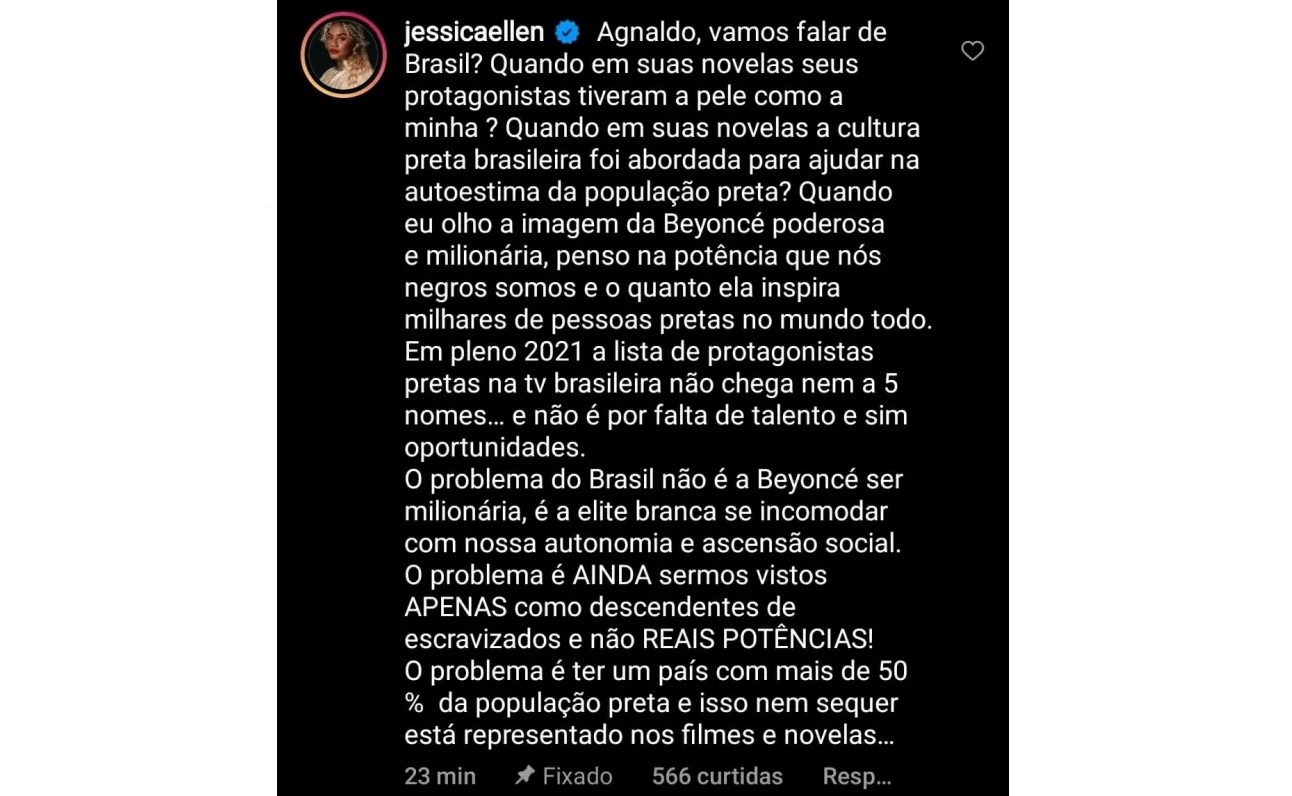 “Em pleno 2021 a lista de protagonistas pretas na TV brasileira não chega nem a cinco nomes... E não é por falta de talento, e sim oportunidades. O problema do Brasil não é a Beyoncé ser milionária, é a elite branca se incomodar com nossa autonomia e ascensão social. O problema é ainda sermos vistos apenas como descendentes de escravizados e não reais potências! O problema é ter um país com mais de 50% da população preta e isso nem sequer estar representado nos filmes e novelas..." , finalizou Jéssica Ellen.