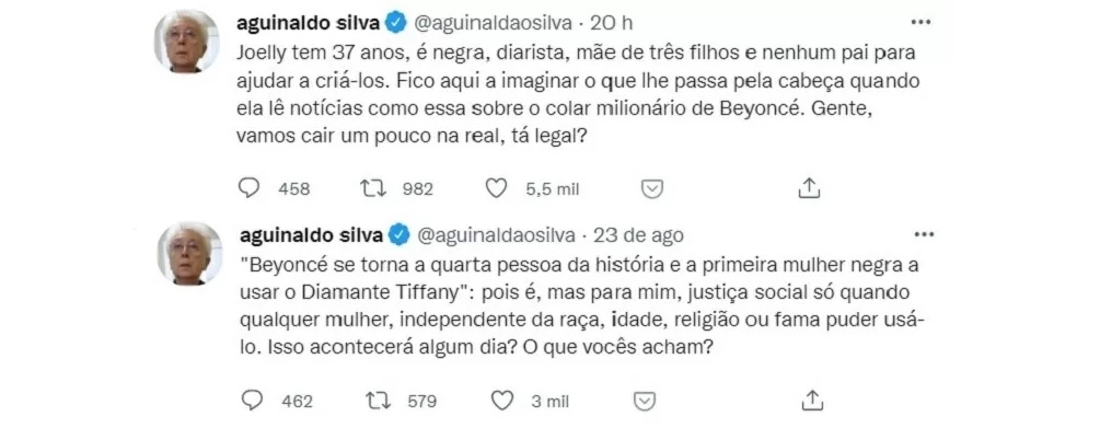 "Joelly tem 37 anos, é negra, diarista, mãe de três filhos e nenhum pai para ajudar a criá-los. Fico aqui a imaginar o que lhe passa pela cabeça quando ela lê notícias como essa sobre o colar milionário de Beyoncé. Gente, vamos cair um pouco na real, tá legal?", escreveu o autor no Twitter. “Para mim, justiça social só quando qualquer mulher, independentemente da raça, idade, religião ou fama, puder usá-lo. Isso acontecerá algum dia? O que vocês acham?”, completou.