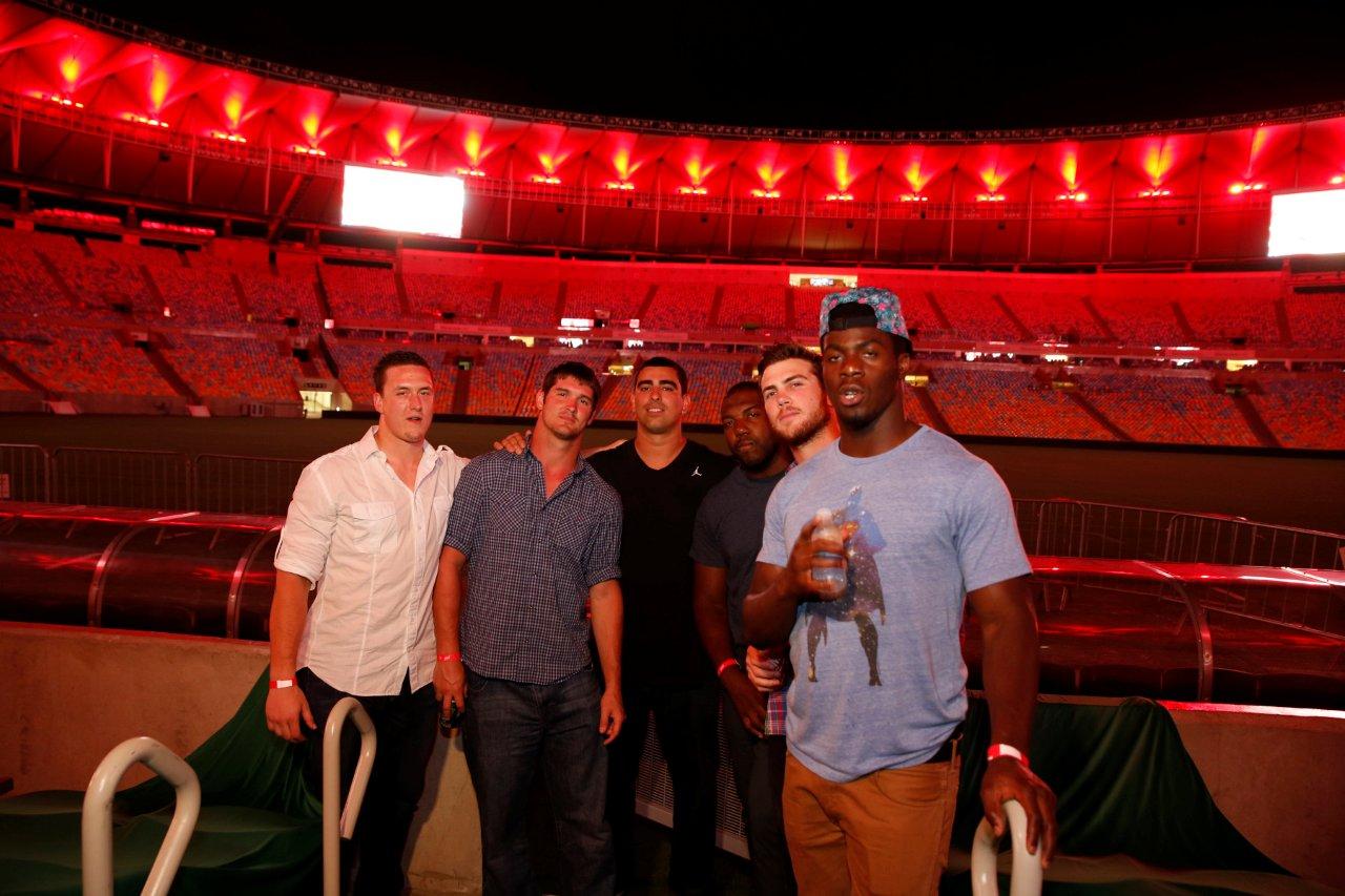 Jogadores do Super Bowl dançam no camarote Brahma no Maracanã